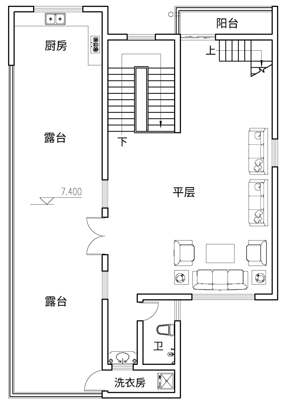客廳、餐廳、廚房、臥室、公衛(wèi)、陽臺、露臺。