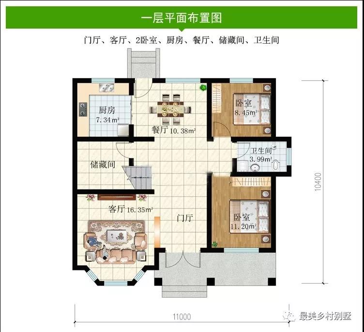 ▲一層功能:門廳、客廳、2臥室、廚房、餐廳、儲(chǔ)藏間、衛(wèi)生間