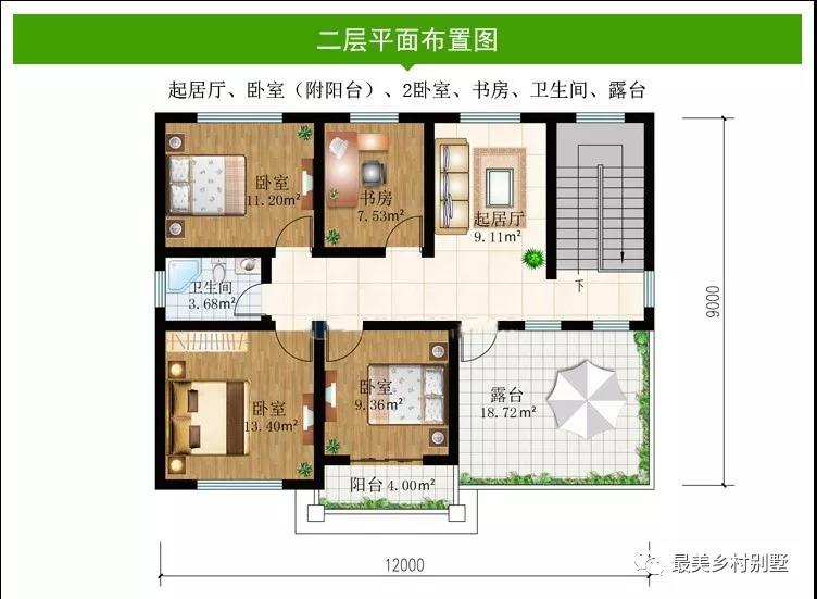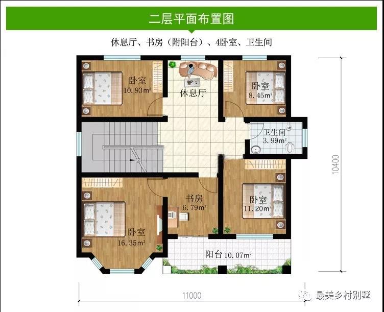 ▲二層功能:休息廳、書房(附陽(yáng)臺(tái))、4臥室、衛(wèi)生間