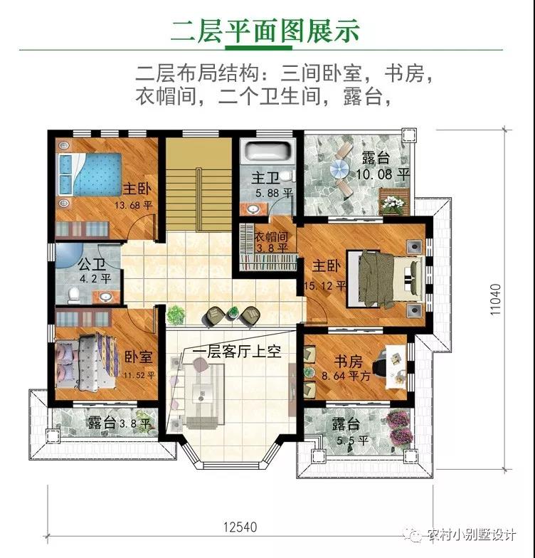 二層平面圖:3臥室,書房,2衛(wèi)生間