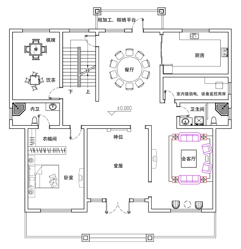 客廳、餐廳、廚房、臥室、公衛(wèi)、陽臺(tái)、露臺(tái)。