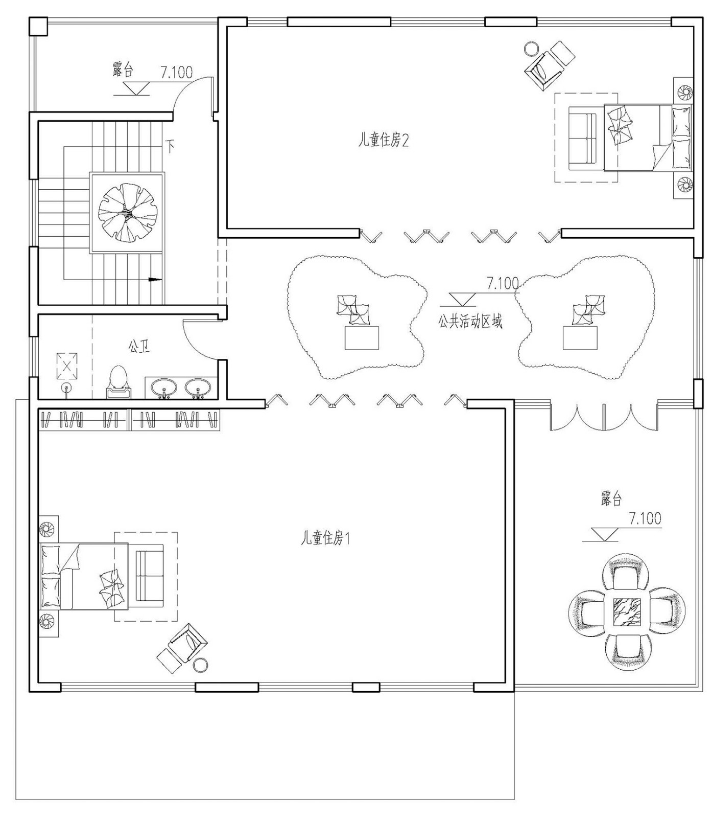 客廳、餐廳、廚房、臥室、公衛(wèi)、陽臺、露臺。