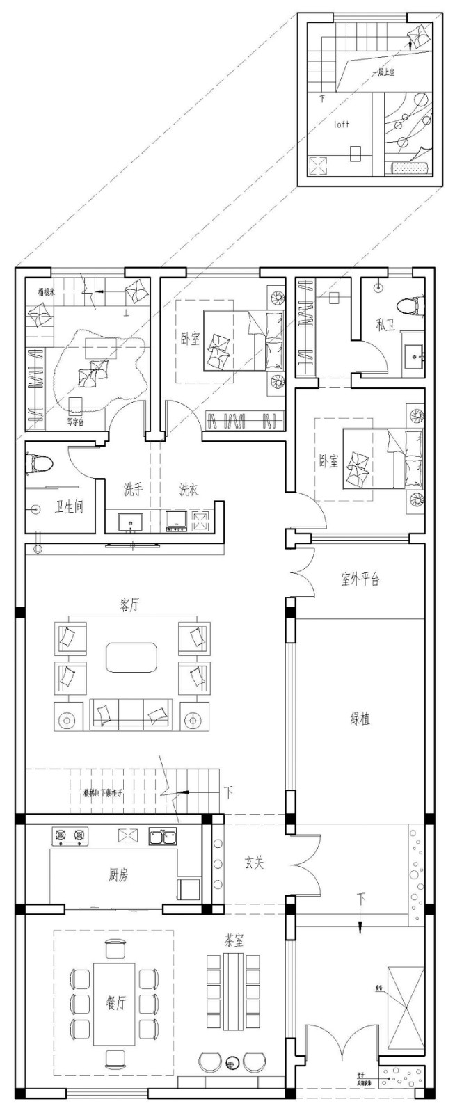 客廳、餐廳、廚房、臥室、公衛(wèi)、陽臺、露臺。