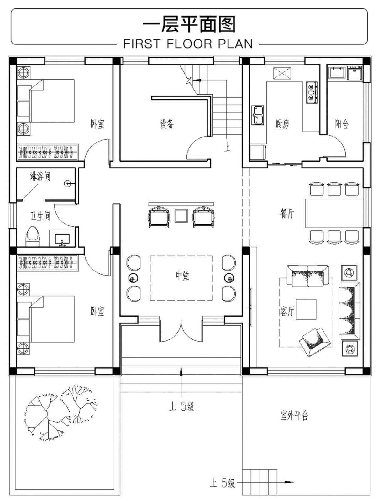 客廳、餐廳、廚房、臥室、公衛(wèi)、陽臺、露臺。