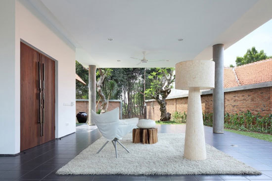 這幢房屋設計非常的別致,住宅有兩個顯著的特點:陶瓷屋頂和寬大的百葉窗。別墅在周圍茂密的熱帶森林的環(huán)繞中,顯得異常寧靜。