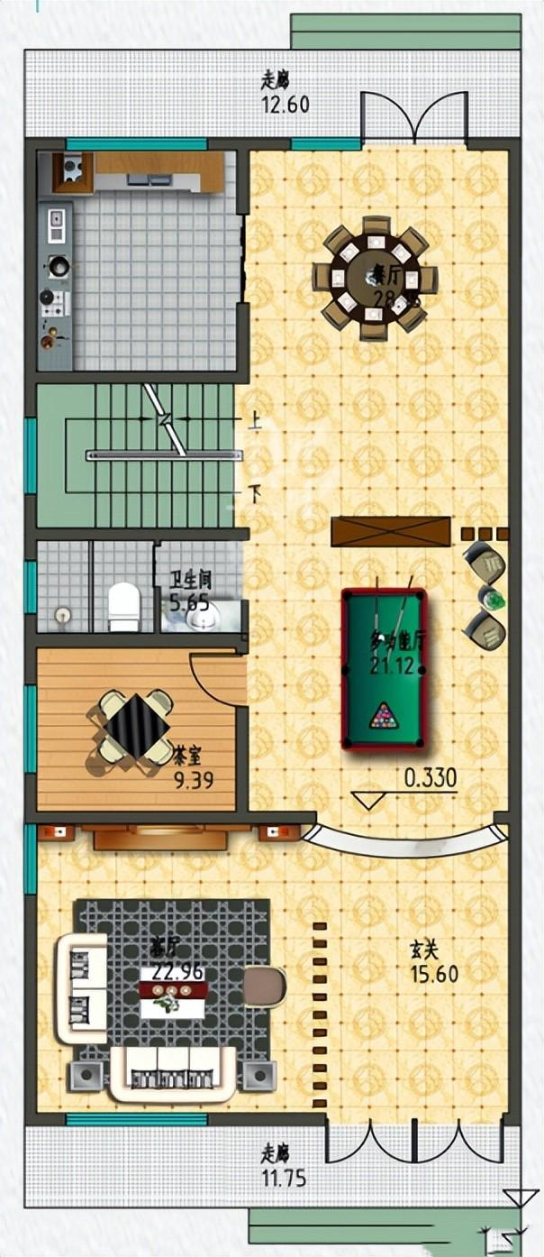 別墅一層進(jìn)門為玄關(guān),起到隔斷視線的作用,避免入戶即見(jiàn)客廳,提高居住私密性。東側(cè)多功能廳可根據(jù)實(shí)際需求使用作成棋牌室,滿足全家休閑體驗(yàn)。