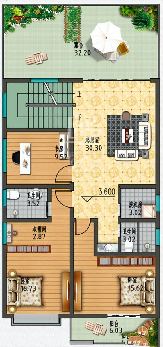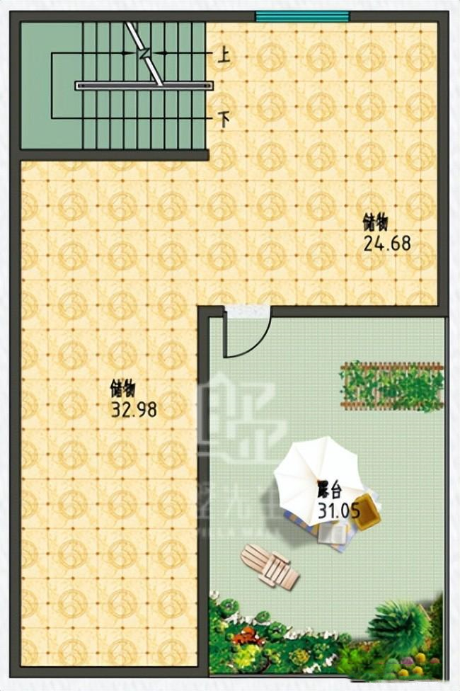 四樓為閣樓空間,但也貼心設(shè)計(jì)成了露臺(tái)與儲(chǔ)藏間,更方便使用。平時(shí)有閑情逸致時(shí)可在露臺(tái)種上一些花花草草,打造一處私人的露臺(tái)花園。
