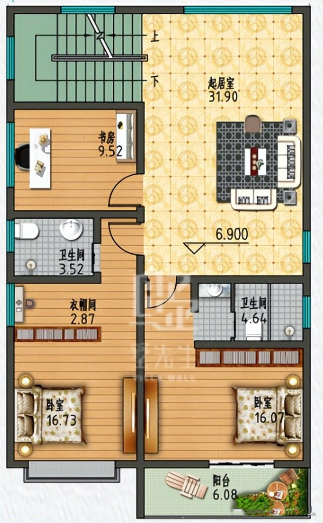 二樓以休息空間為主,共有兩間臥室、一間書(shū)房與起居室。其中主臥帶有獨(dú)立衛(wèi)生間與衣帽間,私密性強(qiáng),居住體驗(yàn)佳。二層共設(shè)一個(gè)陽(yáng)臺(tái)和一個(gè)大露臺(tái),晚上可在露臺(tái)觀賞夜景,白天享受日光浴,十分愜意。