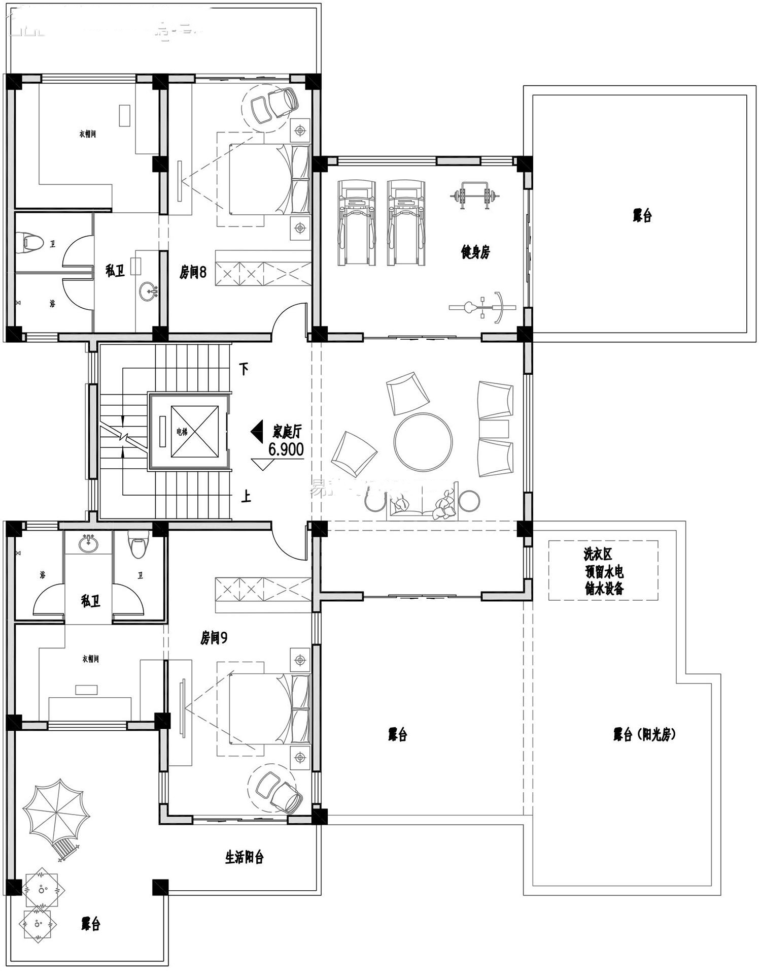 3層 / 9室 3廳 10衛(wèi) 1廚 1堂屋 土灶 1儲物 8衣帽 1書房 1茶區(qū) 1活動室 1休息區(qū) 1多功能房 1健身房 7陽臺 3露臺 1陽光房 1車庫