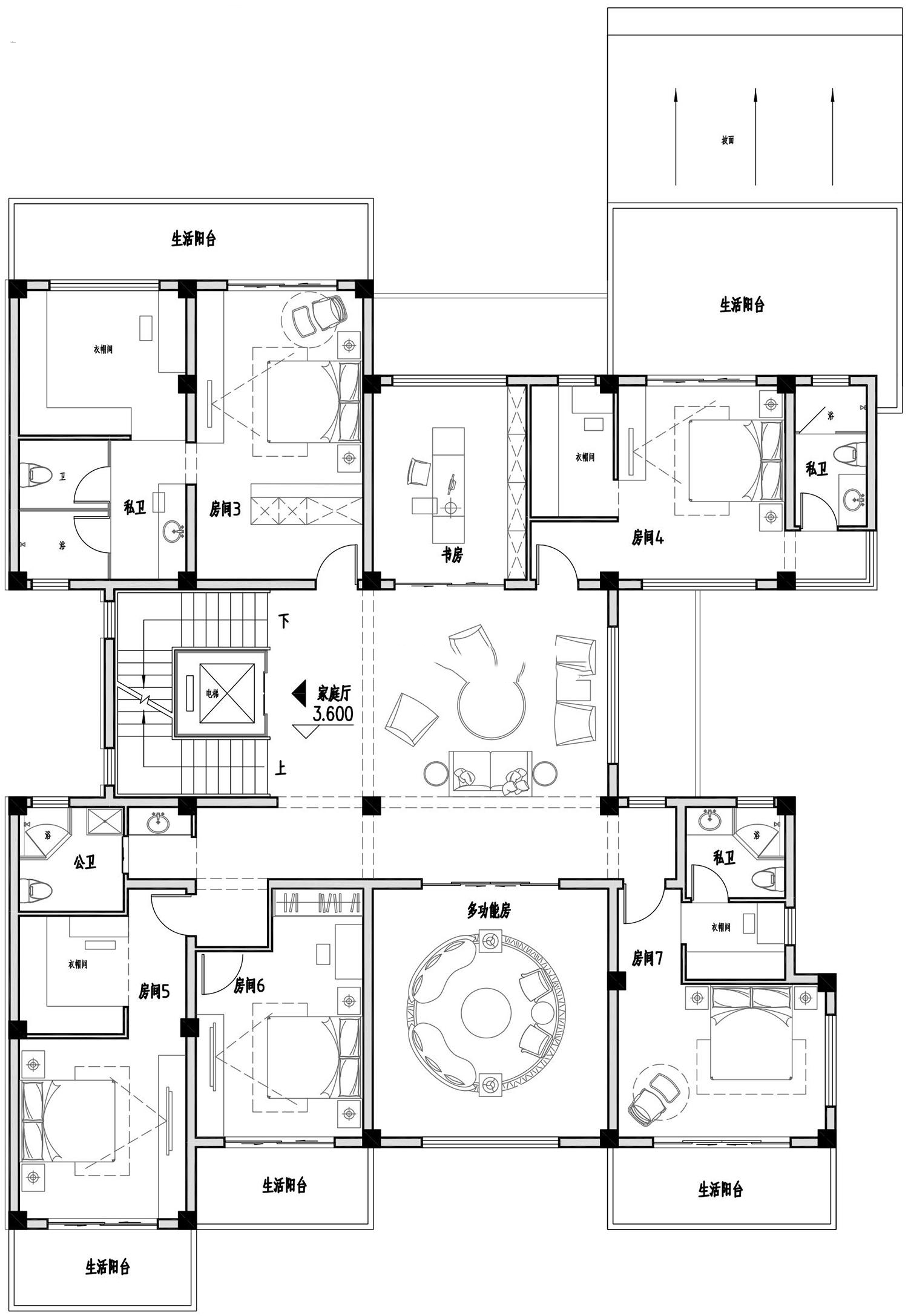 二層以居住休閑為主,整層共設(shè)置5間臥室,中部的休閑廳與書房相鄰,可供業(yè)主及其家人辦公休閑使用。