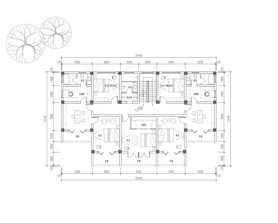 二層主要是居住為主,5個(gè)臥室,南面三個(gè)臥室都有單獨(dú)的外廊道