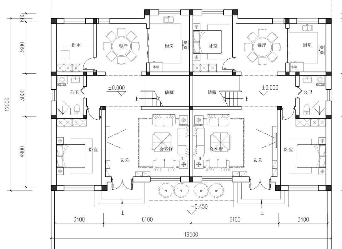 這個(gè)雙拼房屋設(shè)計(jì)是對(duì)稱式布局的,一層入戶玄關(guān),右手邊是一個(gè)大會(huì)客廳,玄關(guān)和會(huì)客廳聯(lián)通,讓室內(nèi)空間更加開闊。一層總共布置兩間臥室,餐廚空間在北側(cè),樓梯下的空間做儲(chǔ)藏間。
