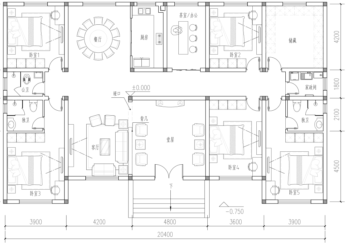 先和朋友們了解一下建筑的整體尺寸,總面寬是20.4m,總深度是12.6m,室內(nèi)外高差是0.75m,一層建筑高度是3.6m,屋頂最高點(diǎn)高度是6.6m。