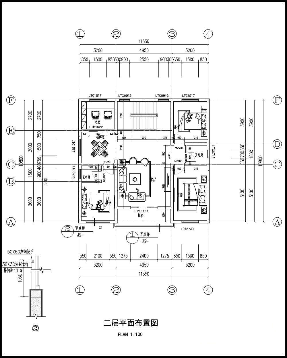 二層:三室一廳一陽臺(tái)兩衛(wèi)一休閑室一書房一樓梯