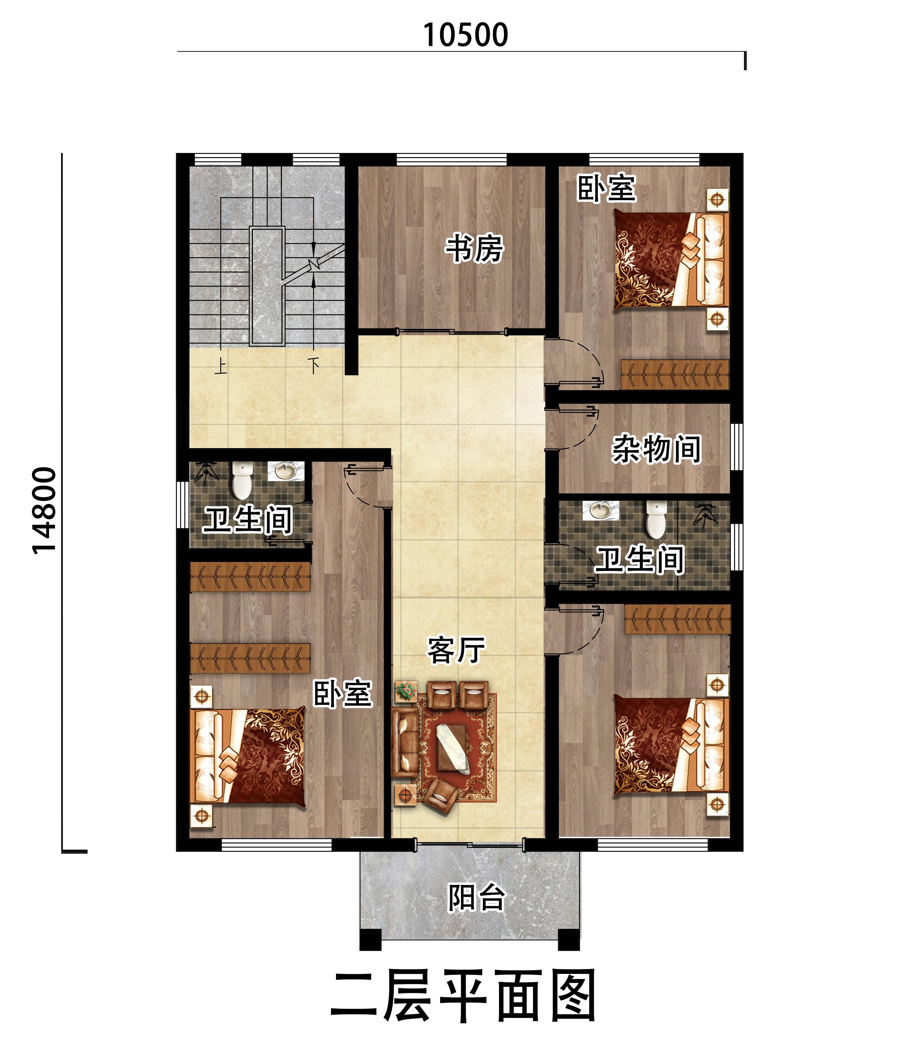 二樓布局圖:三間臥室、公衛(wèi)、內(nèi)衛(wèi)、雜物間、書房、客房。
