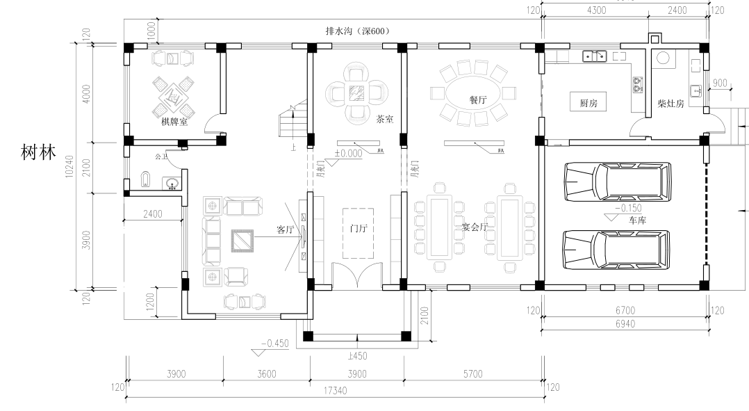 新中式三別墅設(shè)計圖一層主要是做接待客人,所以并沒有給業(yè)主做臥室的設(shè)計,大門方向朝南,入戶便是門廳,設(shè)有茶室,好友談天說地品茶基地,門廳左側(cè)是客廳,西北角是娛樂室,門廳往東是一個大的宴會廳,可容納20人聚餐,東北面是廚房和餐廳日常家人飲食場所,廚房旁邊帶了柴灶房,最東邊是個能容納兩輛車的車庫。