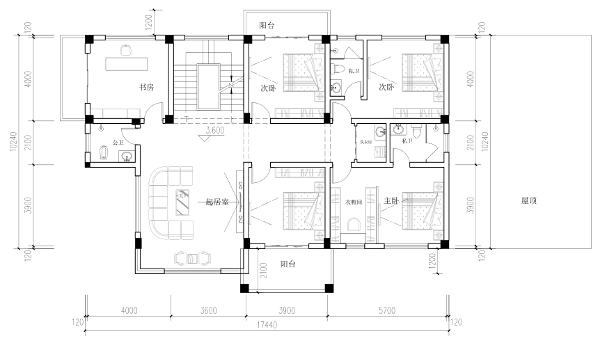 新中式三別墅設(shè)計圖一層做了接待,二層主要是居住功能有四個臥室,一個書房,一個起居室,其中臥室有一間大主臥,帶衣帽間以及私衛(wèi),另一間帶了私衛(wèi),其余不帶衛(wèi)生間。
