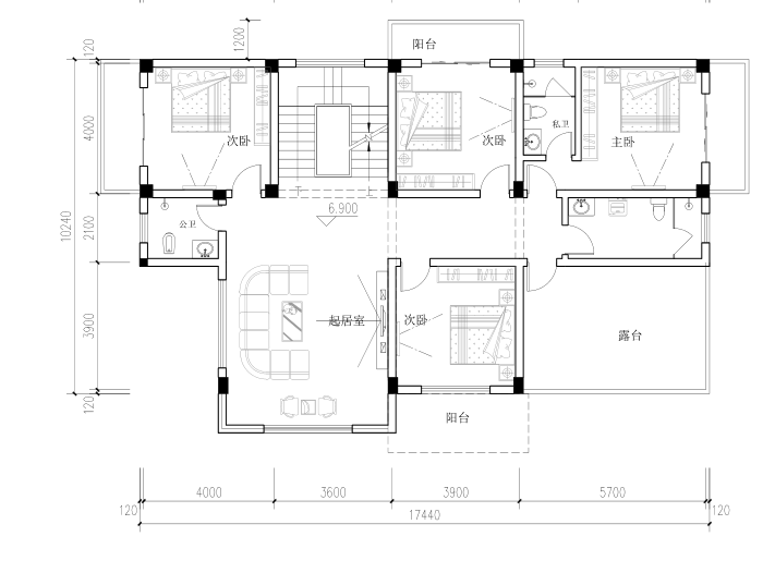 新中式三別墅設(shè)計圖三層以居住為主,共有四間臥室加一個家庭起居室,東南角留了一個大露臺,可供家人的日常家庭聚餐或者日常的清洗晾曬衣物等。