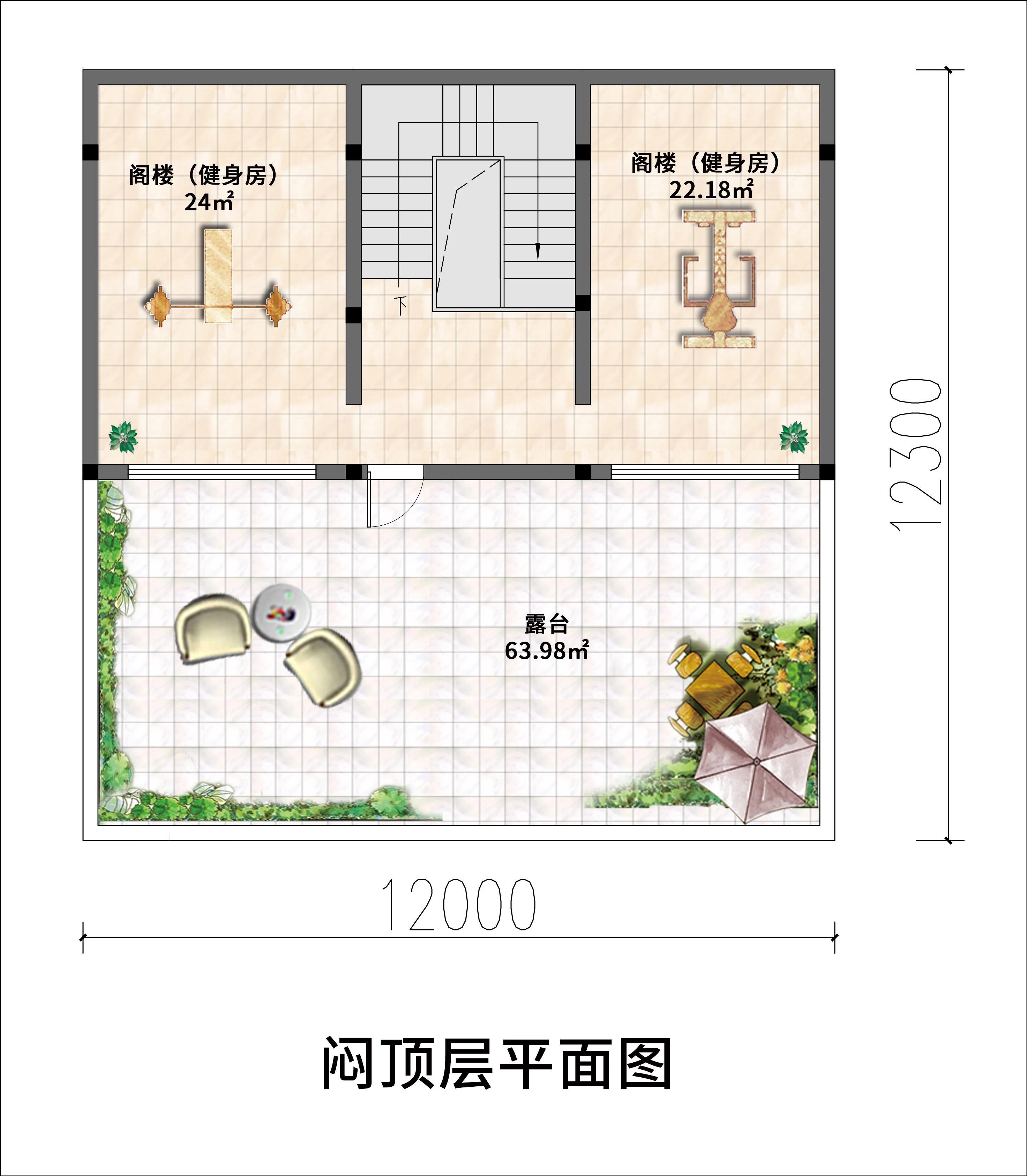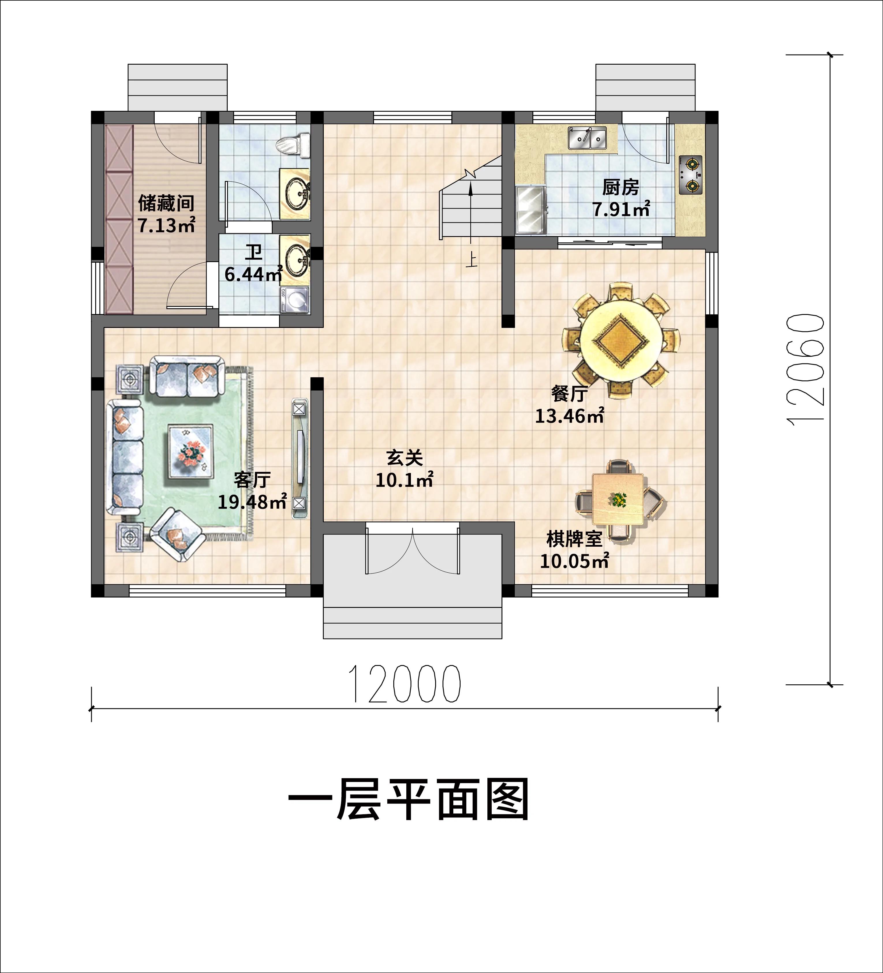 房屋設(shè)計(jì)圖一層:門庭較高,較好地過渡了室內(nèi)室外空間。室內(nèi)布局實(shí)用簡(jiǎn)單,餐廳與棋牌室結(jié)合,空間更加通透,居家環(huán)境也更舒適。