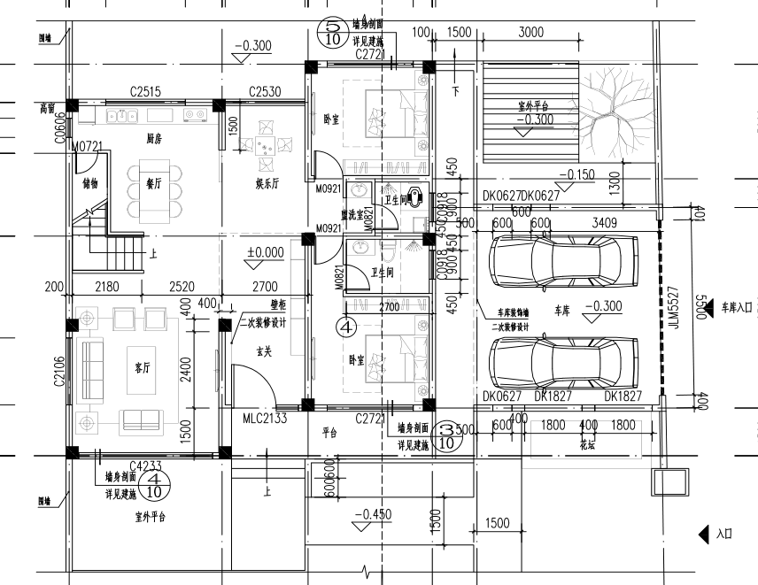 一層入門處設(shè)計了玄關(guān),左側(cè)是客廳,右側(cè)是帶獨衛(wèi)的長輩房間,并在東北角留了一間客臥。西北角廚房是開放式廚房,和餐廳一體。一層的院子留了車庫和室外休閑平臺。