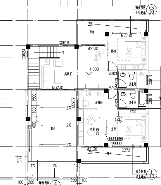 二層樓梯上來是一個起居室,這層主要也是做居住,兩間臥室,一間套間主臥,帶有衣帽間、書房,獨衛(wèi)。西南面有留大露臺,在造型和使用上都有很大的作用。