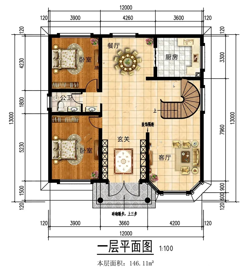 鄉(xiāng)村二層別墅一樓室內(nèi)布局:入戶設(shè)計(jì)了玄關(guān),內(nèi)部設(shè)計(jì)布局合理,保護(hù)隱私;挑空客廳讓室內(nèi)更加高挑,彰顯業(yè)主生活。采光通風(fēng)效果良好,旋轉(zhuǎn)樓梯提升了別墅的整體氣勢(shì)和品質(zhì);公衛(wèi)旁設(shè)計(jì)了2間臥室,起居方便,適合長(zhǎng)輩居住。