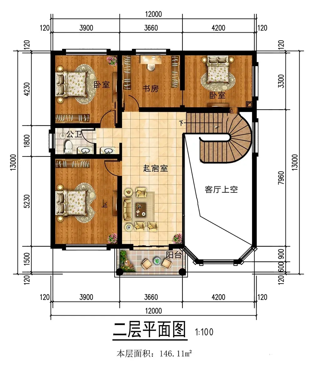 鄉(xiāng)村二層別墅二樓室內(nèi)布局:二樓以生活居住區(qū),共設(shè)計(jì)3間臥室,一家人居住足夠,還可留出備用客臥;單獨(dú)設(shè)計(jì)的書房,為孩子的學(xué)習(xí)提供安靜的氛圍;起居室讓家人休息時(shí)方便溝通交流,增進(jìn)感情。