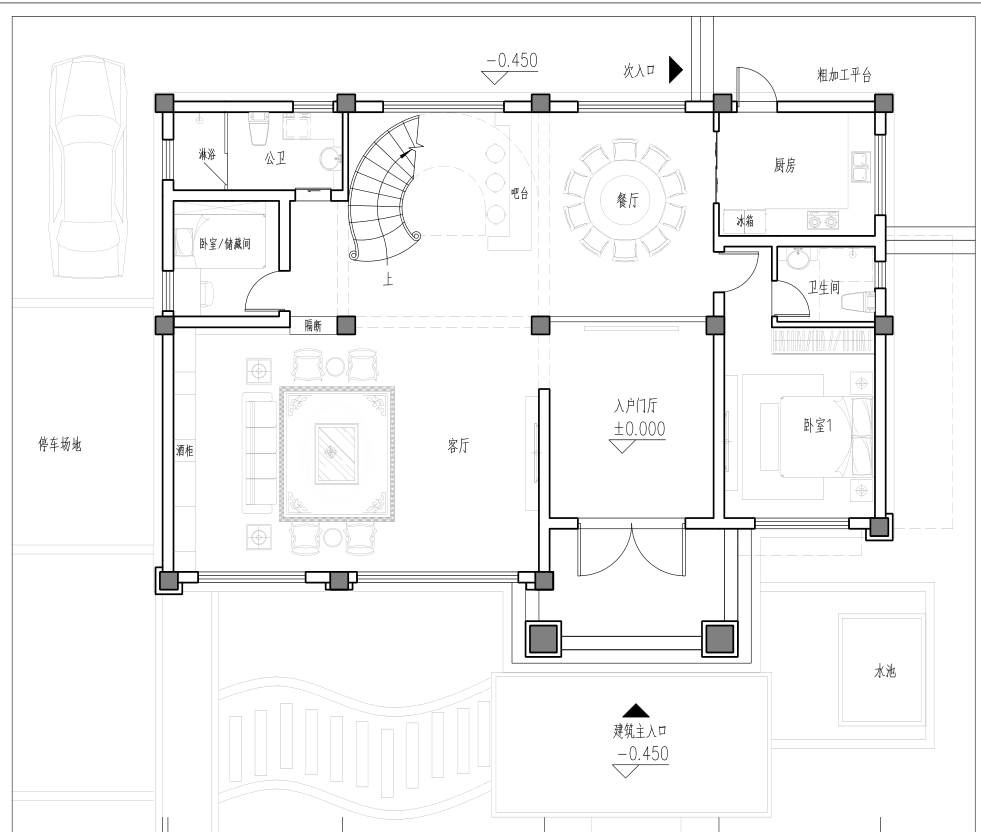 一層的布局設計的是比較寬敞的,進門是門廳,有一個過渡的空間,客廳在50平方叢,并且客廳上空做了挑空設計,布置了公共衛(wèi)生間和儲藏間,旁邊是一個旋轉樓梯,底下設置吧臺,和餐廳相連接,廚房帶有粗加工平臺,一間臥室方便長輩日常使用。