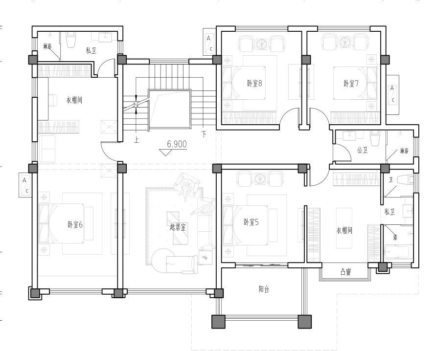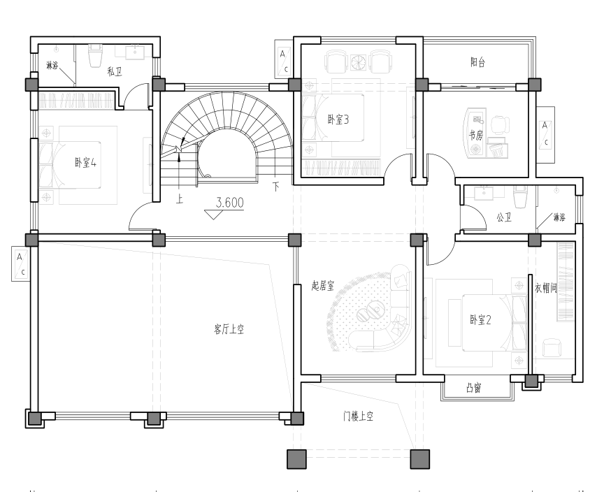 二層是多間臥室組成,總共有三個臥室一間書房,保證了居住的私密性和舒適度。