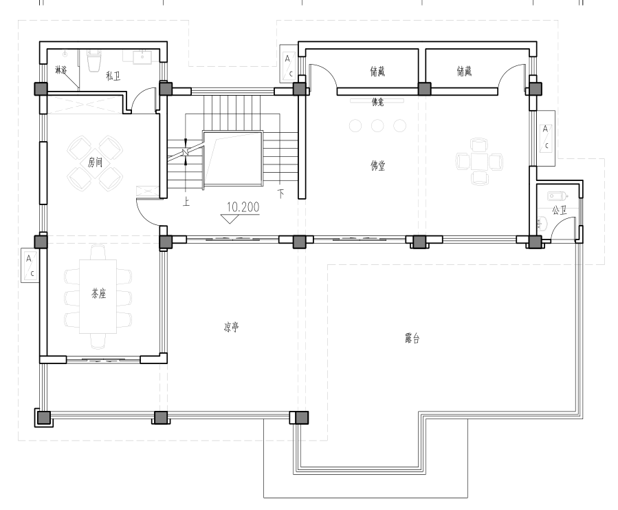 四層空間設置了佛龕位置,外面設置了涼亭和大露臺。