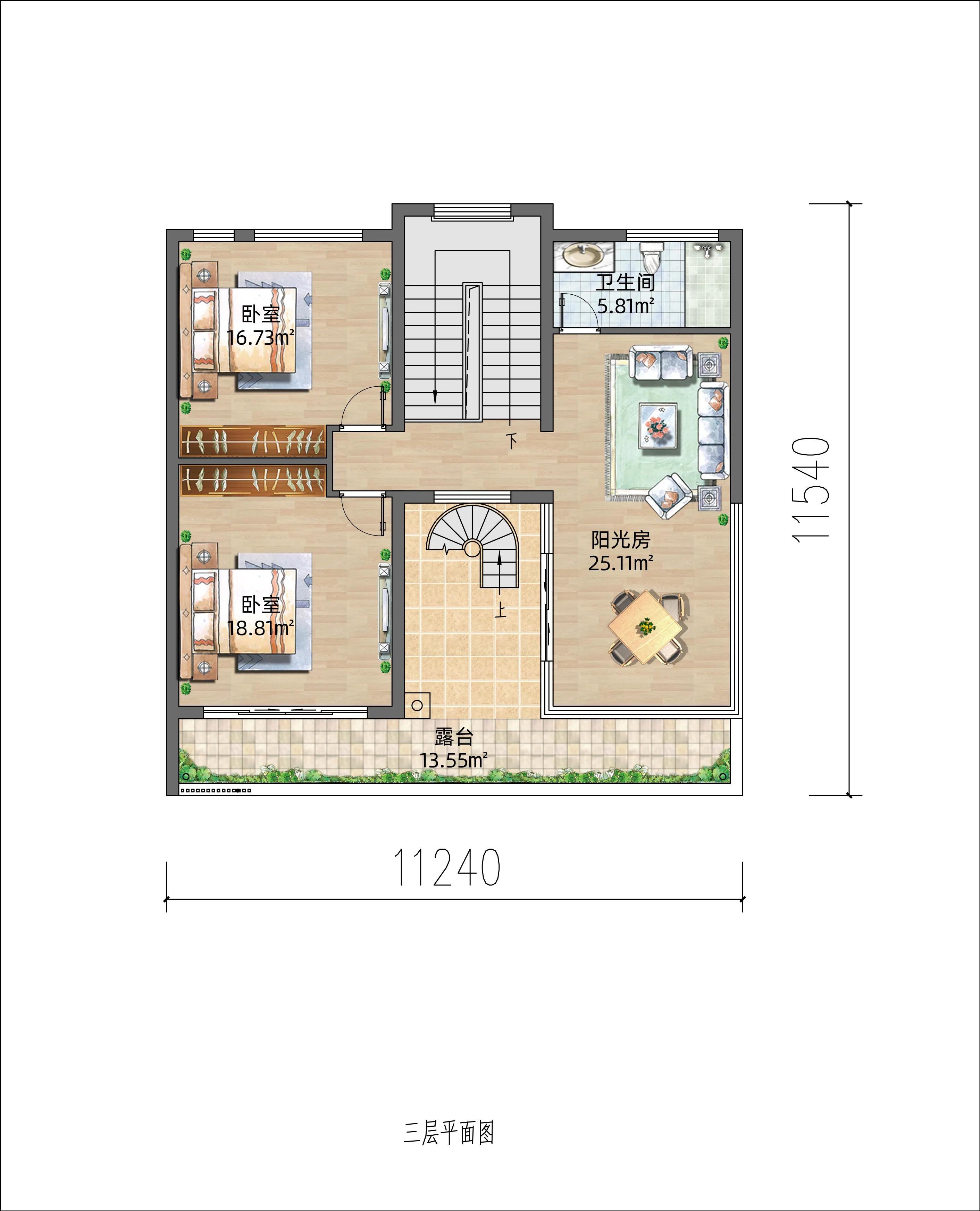 三層設(shè)計(jì)兩間客臥,寬敞的客廳加陽(yáng)光房可容納多人在此暢談,舒適的露臺(tái)滿足不同家人的居住需求。