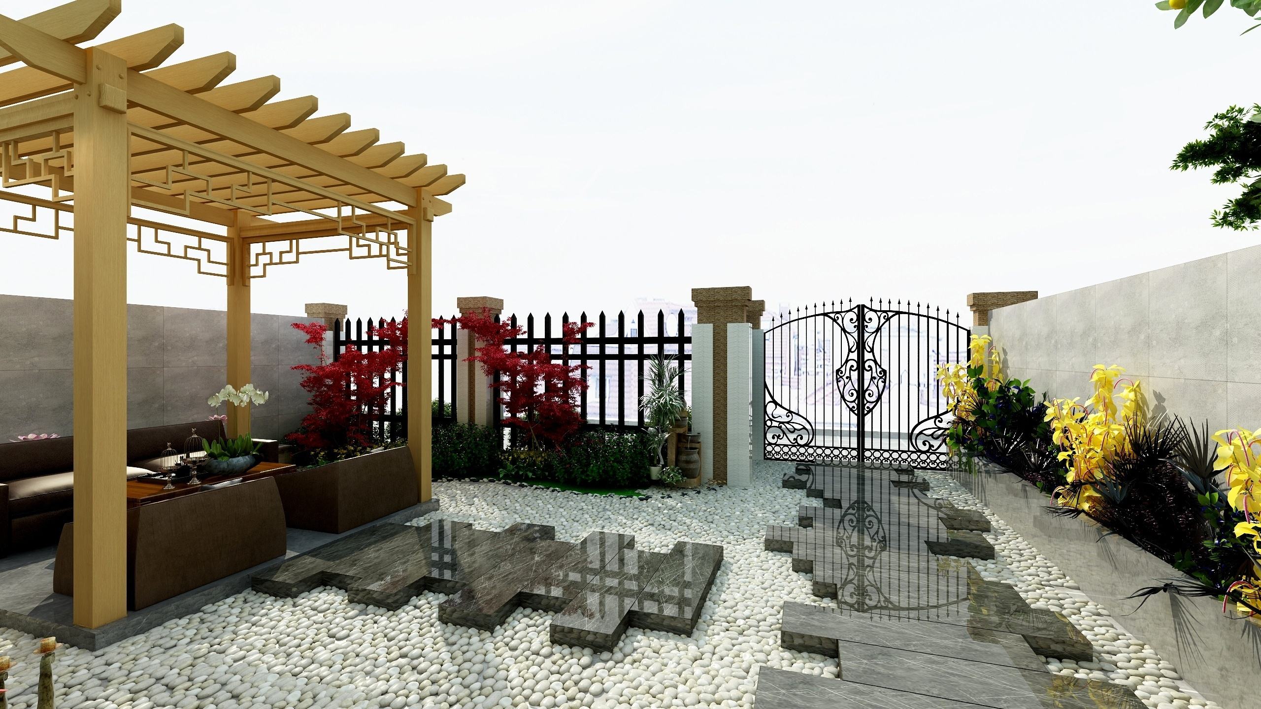 4、別墅小院景觀設(shè)計(jì)還應(yīng)注意材質(zhì)的搭配。在材質(zhì)的選用上,不宜使用過(guò)純、偏硬的材質(zhì),這些都會(huì)讓人覺(jué)得過(guò)于復(fù)雜,尤其是家具等物品。