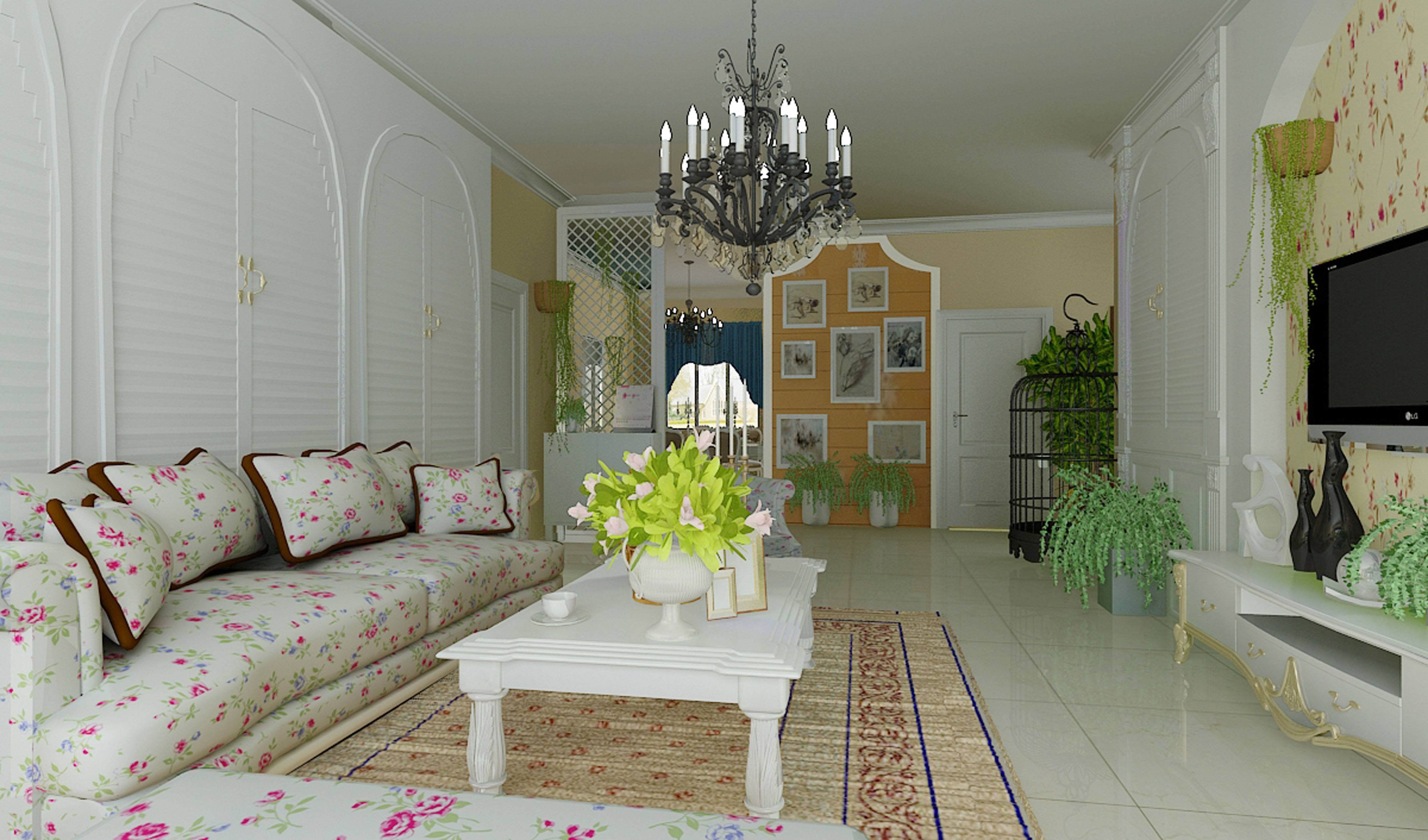 2.田園風(fēng):在別墅客廳的軟裝部分中,軟裝扮得尤為重要,可選擇用輕巧、線條流暢的布藝或織物,配合紅棕植物,創(chuàng)造出清新舒適的氛圍,使居室看起來(lái)干凈整潔、寬敞。