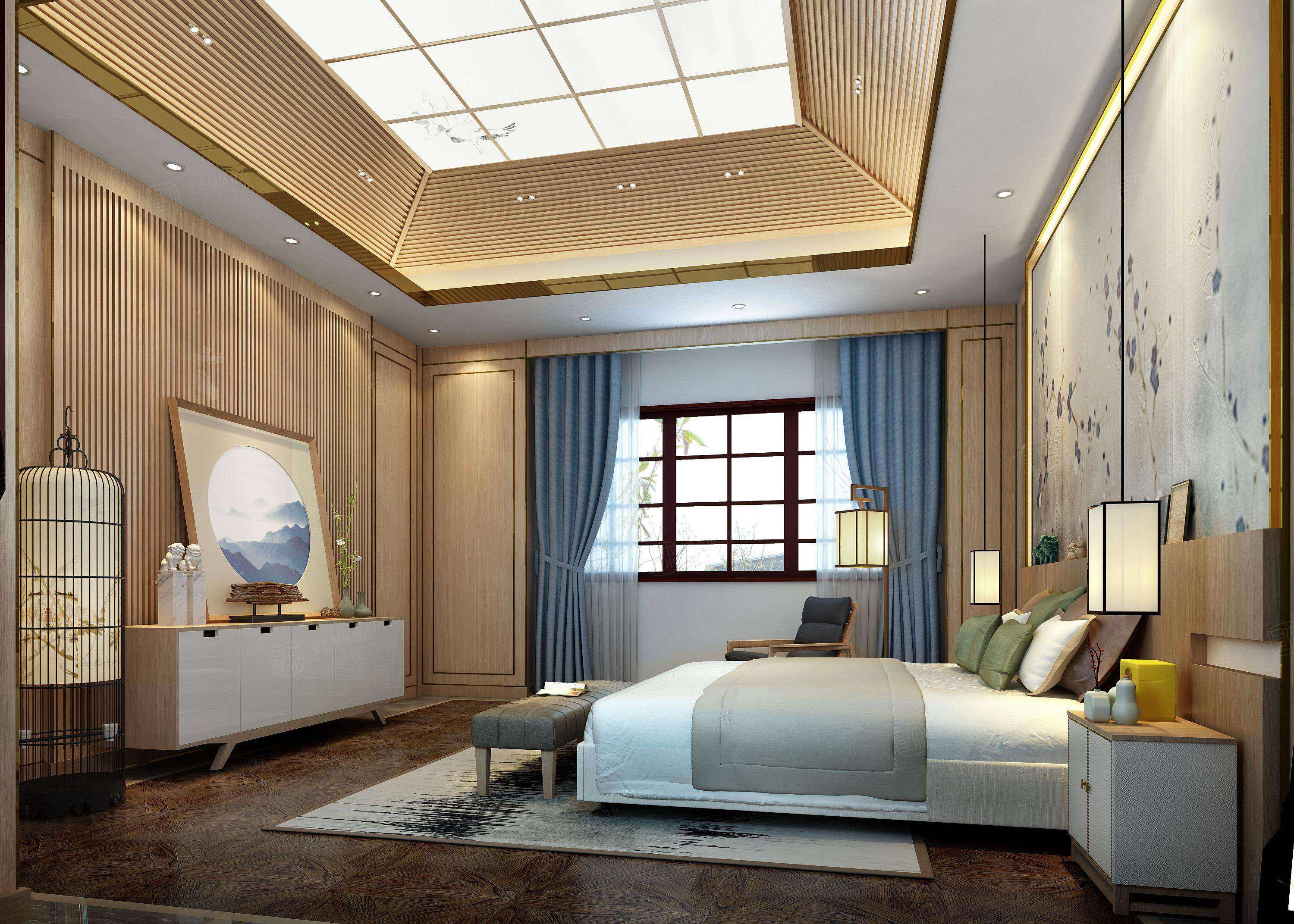 7、臥室:臥室中的床頭柜和衣帽間也可以改成實(shí)木制品或者藤椅等,可以把床墊設(shè)計(jì)成實(shí)木材料,掛上簾子就可以享受到冬暖夏涼的感覺了。
