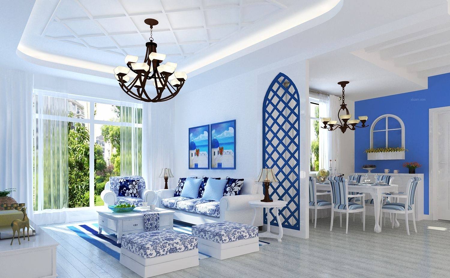 6.地中海風(fēng)情:地中海風(fēng)格給人一種純粹天然的感覺(jué),其設(shè)計(jì)元素主要表現(xiàn)為:藍(lán)、白、灰色調(diào)為基礎(chǔ),并融入了懷舊風(fēng)格的元素。