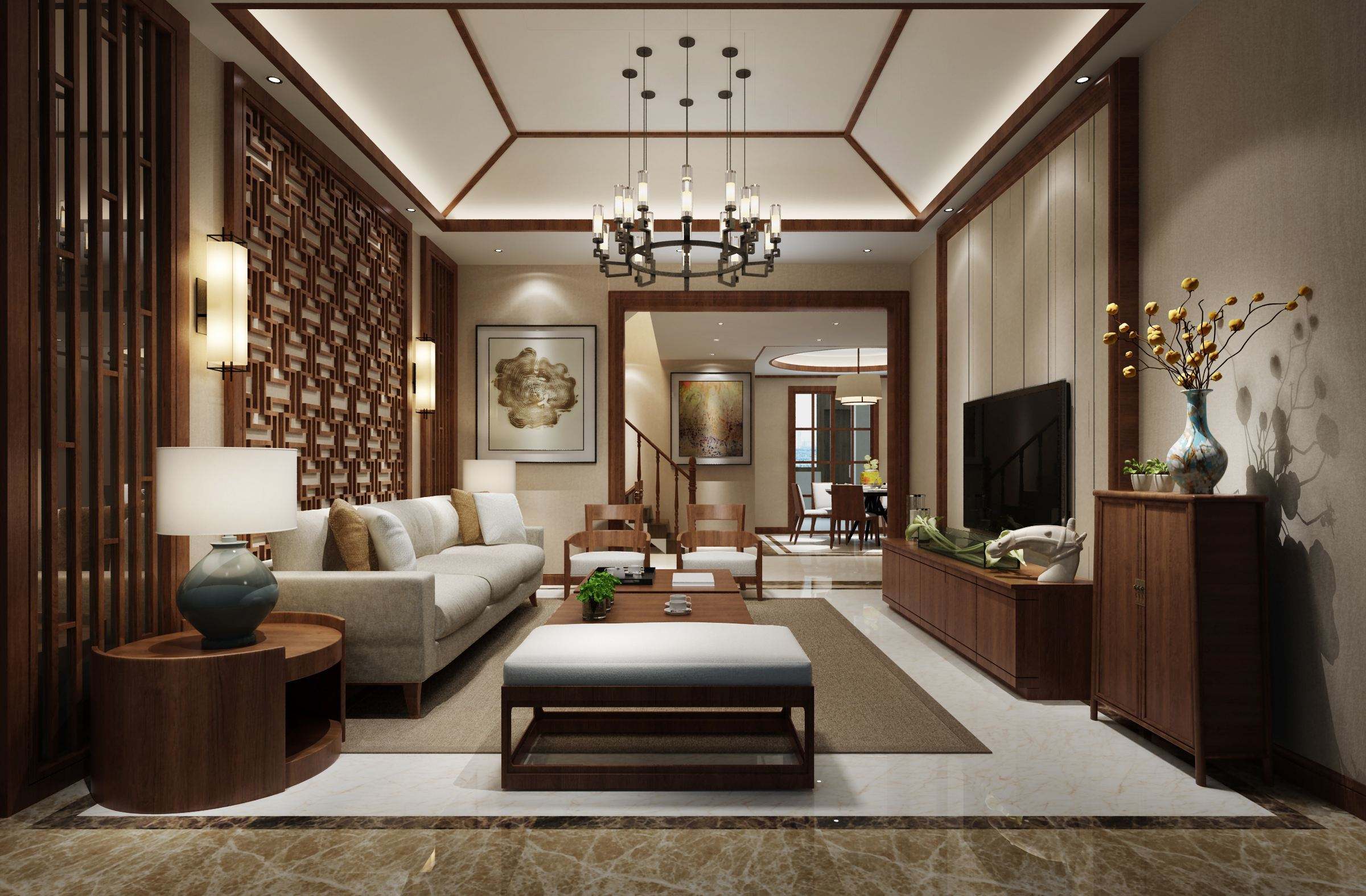 8、別墅客廳裝修。裝飾設(shè)計(jì)的色調(diào)應(yīng)以暖色為佳,因?yàn)槔渖{(diào)會(huì)產(chǎn)生壓抑感,不利于家庭成員的心理暗示和諧。客廳應(yīng)以明亮的色彩為主,這有利于家庭聚財(cái)。