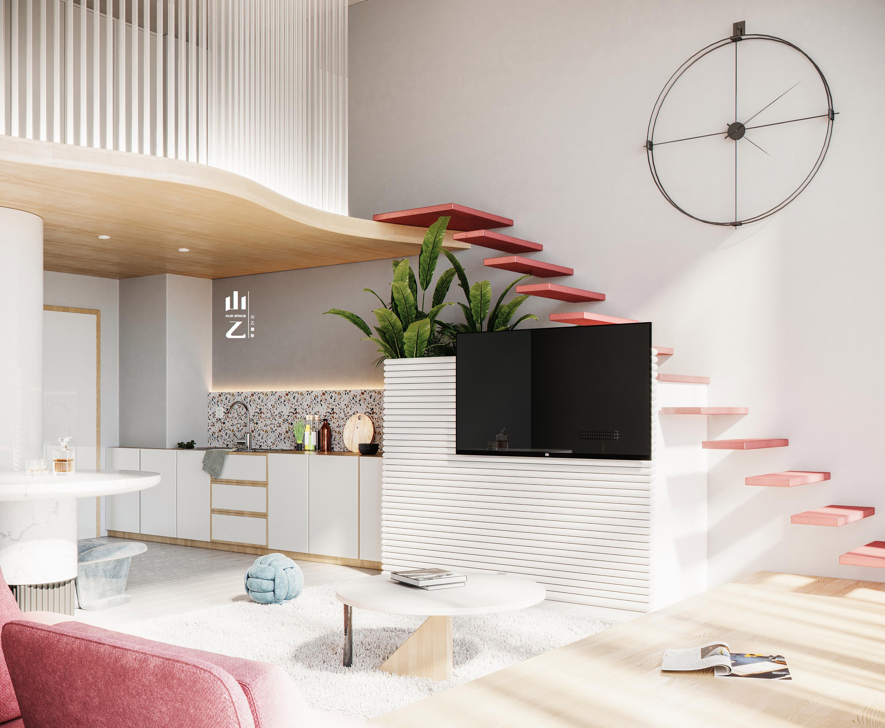 2、復(fù)式樓一般有上下兩層,上層直供休息區(qū)域或客廳等公共功能,二層以上設(shè)計樓梯。