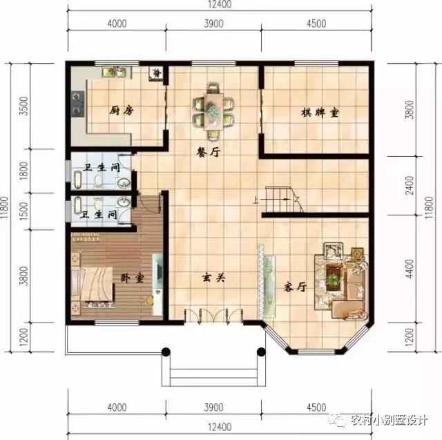 一層平面圖:客廳采用多邊形采光窗,通光性好,棋牌室放在一層,方便,省的村里人來家里打牌還要爬樓梯,也不會(huì)吵到二樓休息的。