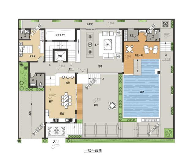 地下停車(chē)庫(kù),地上居住,前后分別預(yù)留出庭院,前庭院主要是泳池和休閑場(chǎng)地,后庭院作為儲(chǔ)物,整體由圍墻圍合而成,形成了合院別墅,高品質(zhì)的居住環(huán)境。