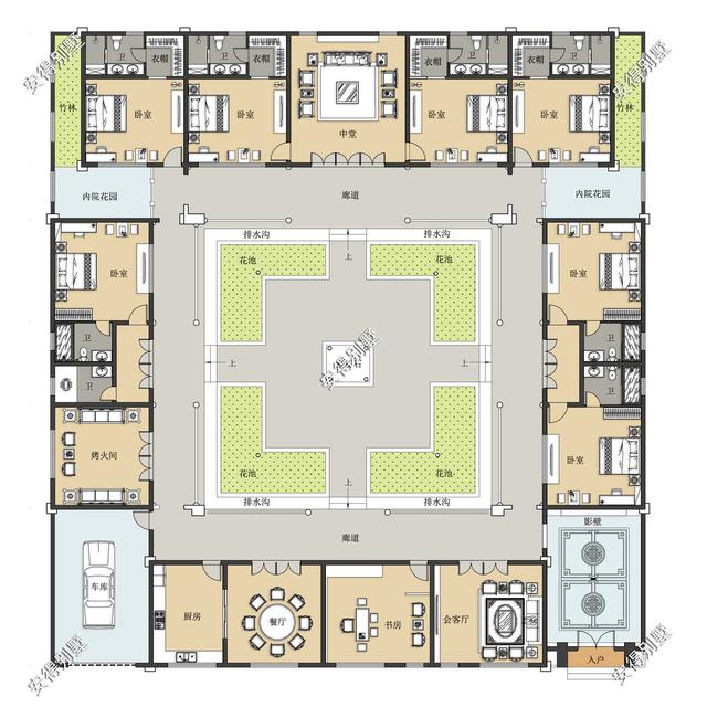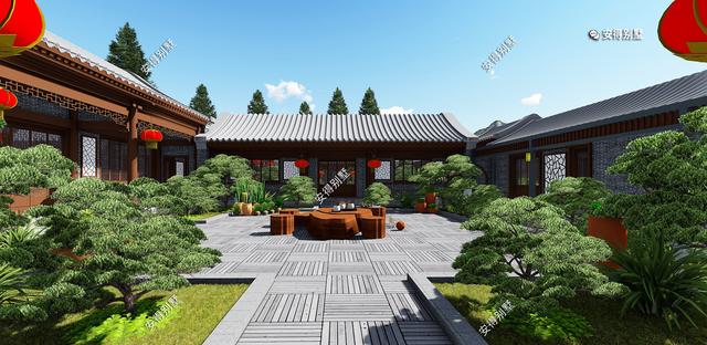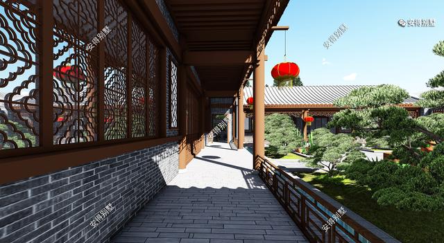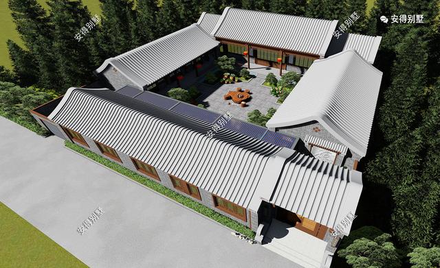 別墅二:這是一款傳統(tǒng)的中式四合院,青磚灰瓦、幽幽廊道、庭院迷人、一步一景,實(shí)在好看。