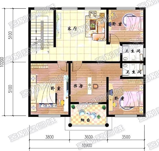 二層:客廳、臥室(帶書房、陽臺、公衛(wèi))、臥室×2、公衛(wèi)