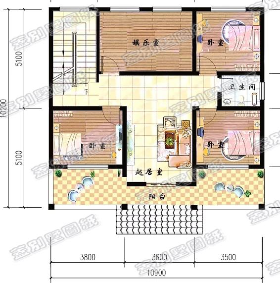 三層:起居室(帶陽臺)、臥室×3、娛樂室、公衛(wèi)