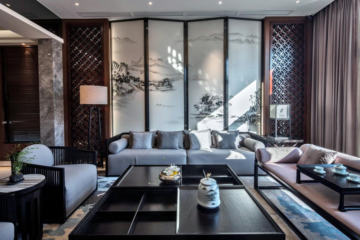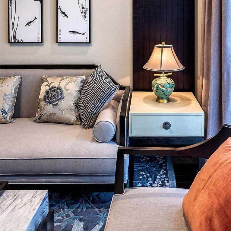 6、家具陳設:新中式風格在家具上講究對稱原則,在制造上多用雕花、隔扇等,并且在陳設上也會選用對應風格的布藝、實木家具等,讓整個室內(nèi)空間看上去非常舒適和自然。