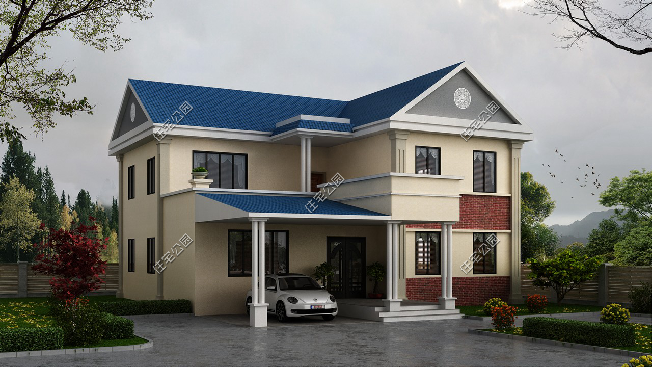 戶型二:這套戶型比較田園,車庫設(shè)計(jì)成了開放式,方便???。藍(lán)色的坡屋頂與米色的外墻搭配的很和諧,造價(jià)也不貴,30多萬的價(jià)格就能把毛坯建出來。