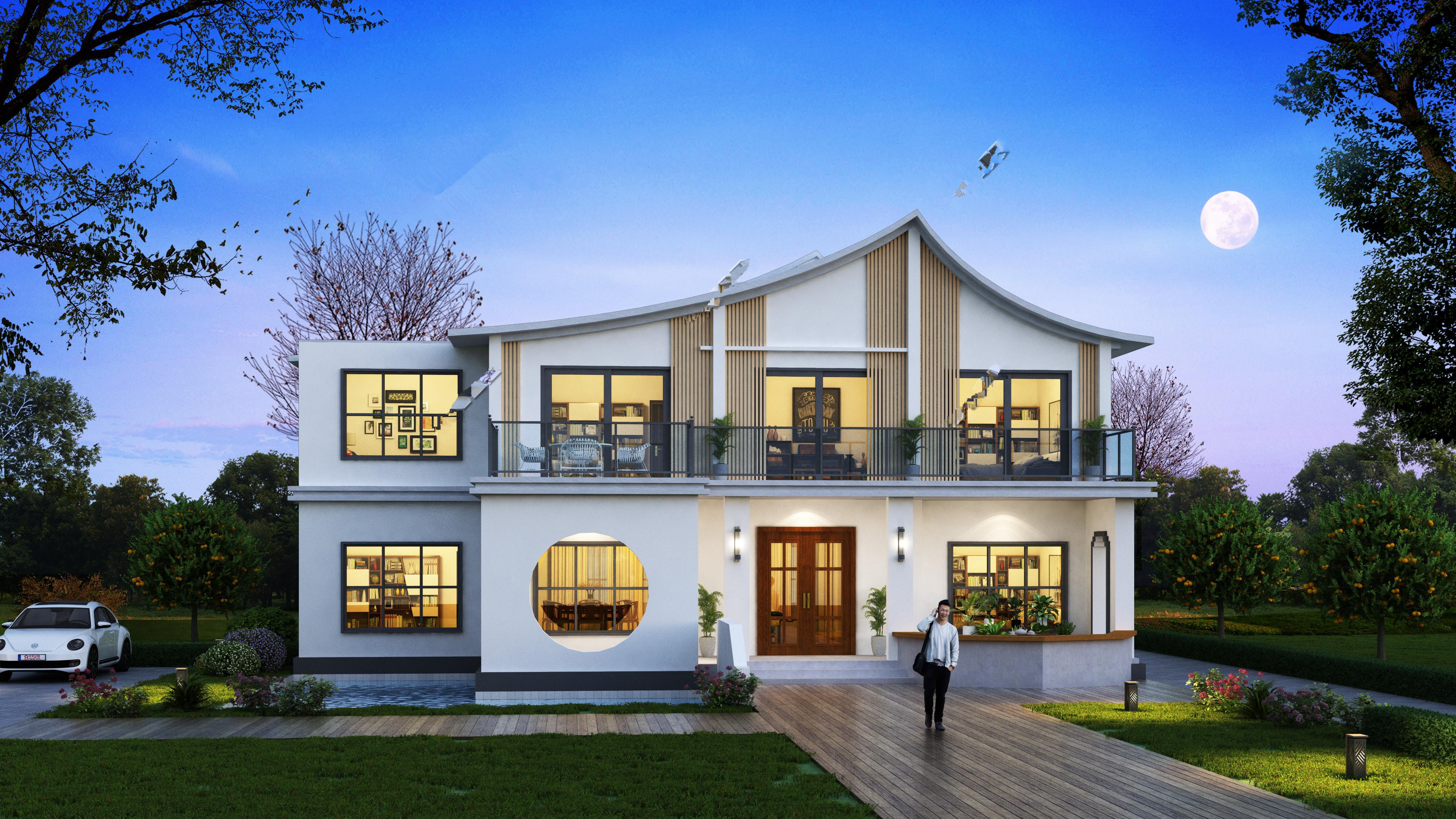 此款農(nóng)村別墅效果圖下圖所示,比一般的新中式風(fēng)格更加的新穎,將現(xiàn)代工藝元素融入其中,呈現(xiàn)于一種別具一格的藝術(shù)氣息。獨(dú)特的人字形坡屋頂,提升房屋外觀質(zhì)感,而外廊處的一扇月亮門,不僅可以引導(dǎo)視線進(jìn)行游覽,還可以成為一處房屋裝飾,透過門洞窺得居室內(nèi)景,頗有情趣。南北通透多設(shè)落地窗,現(xiàn)代工藝與古樸氣韻對撞,呈現(xiàn)出一種別樣的氣質(zhì),同時也提升了居住體驗。