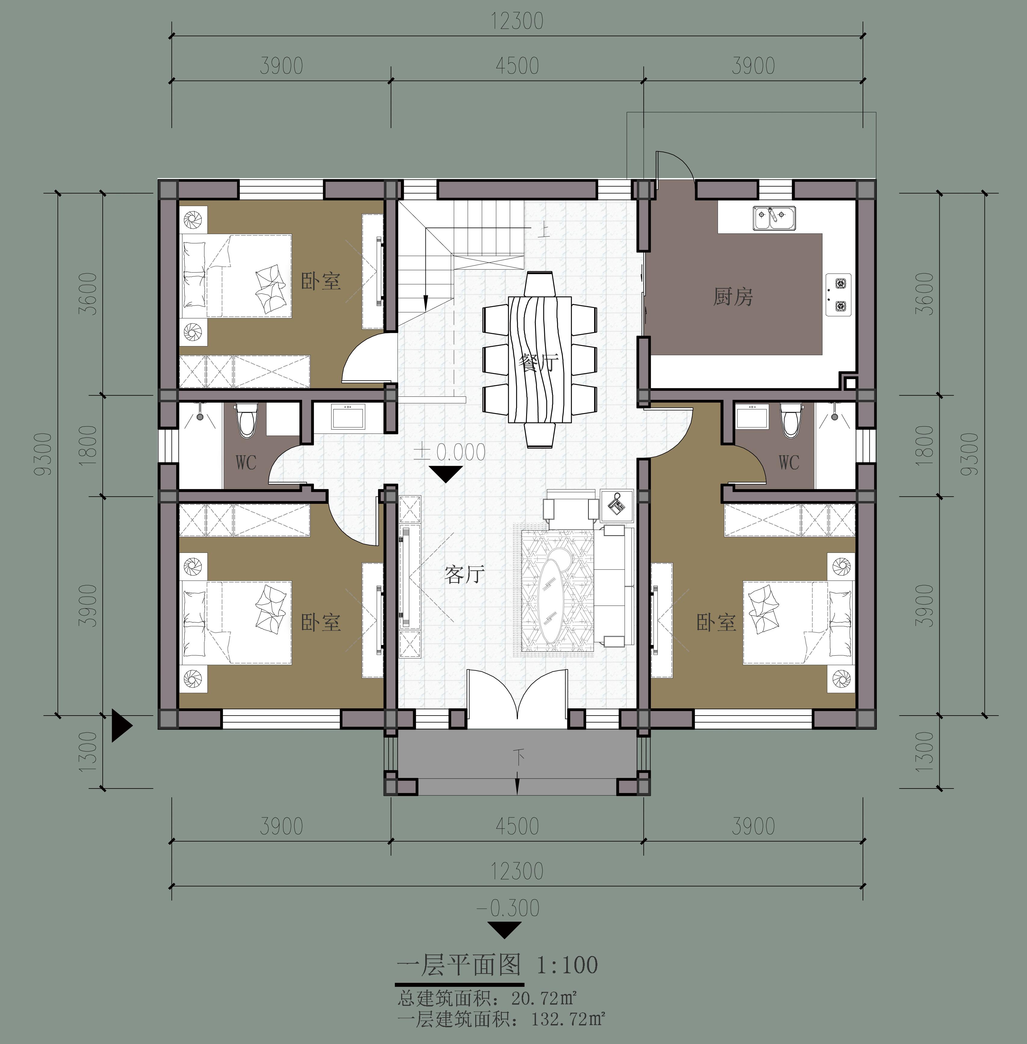 一層戶型圖上帶有3間臥室+兩間衛(wèi)生間,客廳、餐廳和廚房,似乎每個(gè)房間都很方正,這樣的房間布局裝修起來比較方便,省勁,深受農(nóng)村建房者的喜愛。
