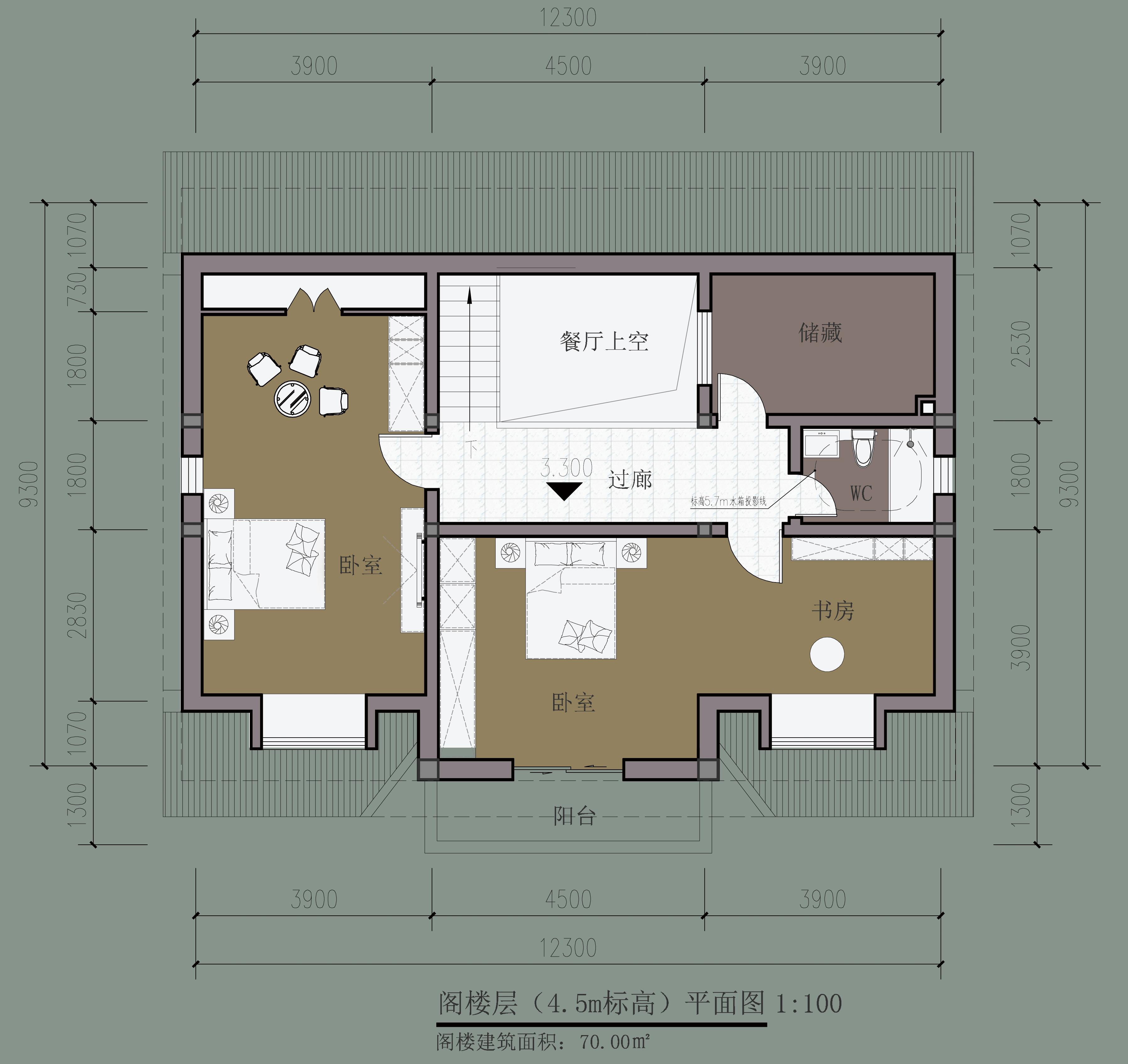 二層閣樓上,別看是閣樓,房間面積可都不小,二間臥室都是直接占了半層的感覺。兩間都有透所窗,一間臥室?guī)菹⑹?,一間帶書房。除此之外,還有一間衛(wèi)生間和儲(chǔ)藏間。