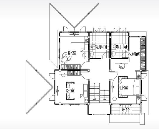 二層平面圖上是三間臥室,兩個衛(wèi)生間。樓上樓下一共4間臥室,一家三口和老人住,很舒適??吹贸鰜?,這棟別墅的占地面積并不大,也更適合常年不住在家里的人們建造,因為它很像個旅館,過年過節(jié)回家來住,非常方便。