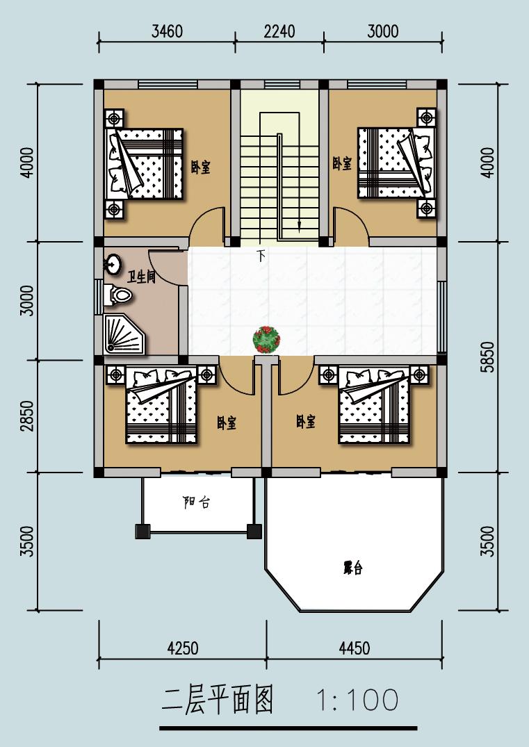 二層平面圖是完美的4間臥室,帶大露臺。兩個孩子和父母 、老人都能住得下,來了客人也不發(fā)愁沒地方住,用不了還可以改造成書房。