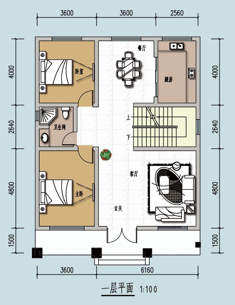 從一層平面圖上可以看出,一層的空間要緊湊一些,不過兩個臥室的空間要相對大一些。